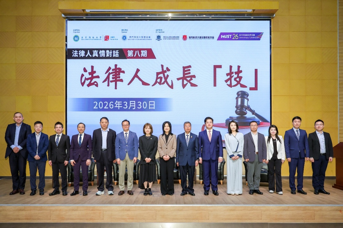 2026年3月30日上午,澳門科技大學 26 周年校慶系列活動之“法律人真情對話(第八期):法律人成長‘技’”活動在大學 N 座 101 禮堂舉行。本場活動由澳門科技大學法學院主辦,澳門科技大學法學院校友會協辦,澳門科技大學基金會支持。澳門科技大學協理副校長、法學院院長方泉教授,校友會聯合總會副理事長兼秘書長湯曦博士,法學院助理院長易在成教授、牟效波課程主任、代孟良副教授、周挺助理教授,法學院校友會劉澤光會長、曾新智理事長、許冰副理事長、林偉權秘書長及返校校友出席是次活動。法學院師生150餘人參與此次活動。