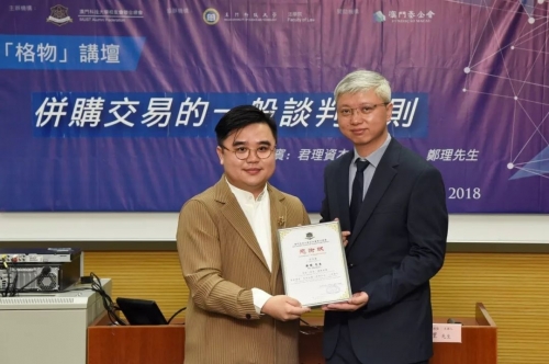 2018年4月20日上午11时,由澳门科技大学校友会联合总会主办,法学院协办,澳门基金会赞助之格物系列讲坛“并购交易的一般谈判规则”,在大学N座图书馆大楼221演讲厅举行。