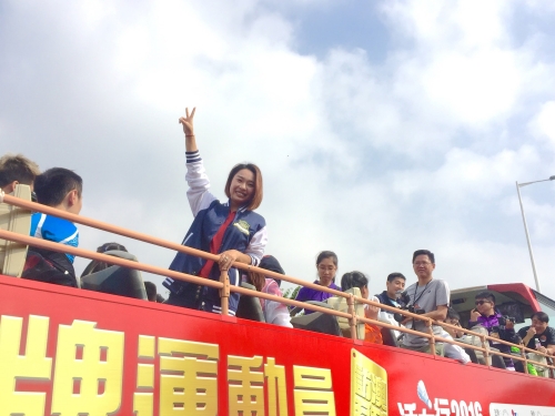 途中偶遇奧運金牌運動員訪澳巡遊巴士,奧運冠軍校友李珊珊在車上與母校及校友方陣揮手致意,車上車下一片歡呼。問及看到大學及校友會隊伍的心情,李珊珊如是說:“老激動了,親人啊~我還是很想念澳門,想念科大的。”