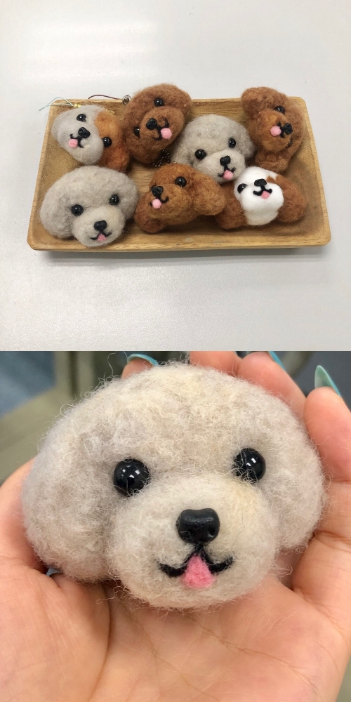 校友們在Angela導師的指導下用戳針將一團團蓬鬆柔軟的羊毛塑造成各種形狀,再用毛團組裝成完整的狗仔頭,使用棕色及灰色羊毛為狗狗進行鋪色裝飾並修飾五官後,憨態可掬的貴婦狗仔就呈現在面前啦,戳扎羊毛的過程可是十分解壓呢!大家更憑靈感製作出“比格犬”“混色狗狗”等各有特色的毛氈製品,並裝飾上別針或掛鏈等做成實用的小飾物。