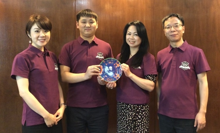 ▲澳科大校友总会汤曦副理事长(左一)、马凯旋副理事长(右二)、冯钧国秘书长(右一)向北京校友会王鹏凯副会长致送纪念品