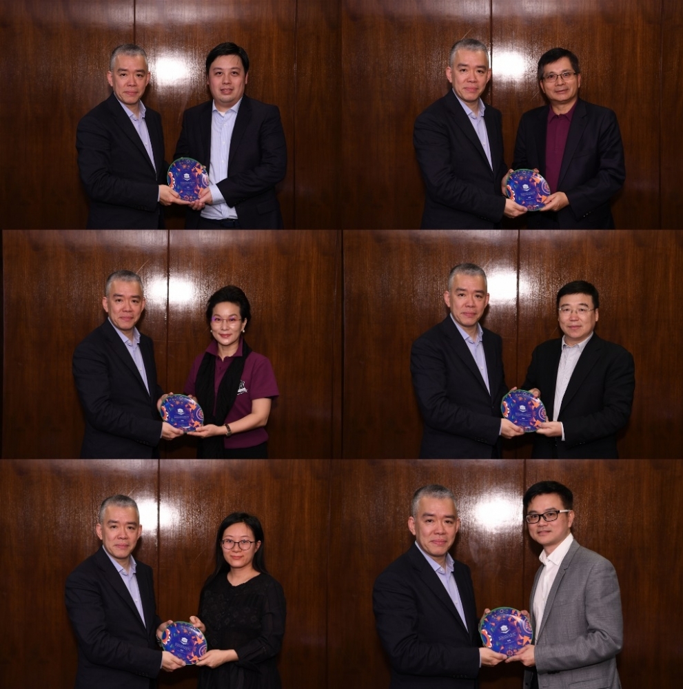 ▲澳门科技大学副校长唐嘉乐博士向澳门校友会徐展文会长、台湾校友会陈清港创会会长、广州校友会续红会长、深圳校友会李鹏志会长、人文艺术学院校友会全希希副理事长、香港校友会筹委会莫锦泉副会长致送纪念品(顺序从左至右,从上至下)