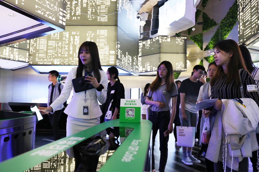 在騰訊總部——騰訊濱海大廈,交流團首先參觀了騰訊科技展廳,了解騰訊公司的企業文化及最新的科技產品,體驗了部份人機互動遊戲。交流團還乘坐可以微信預約召喚的高速智能電梯前往大廈健康連接層,參觀了全國最高的室內田徑跑道、室內攀岩場、籃球場、羽毛球場、書吧、咖啡吧等各種休閒活動空間和設施,體驗騰訊濱海大廈充滿活力的現代化辦公環境。