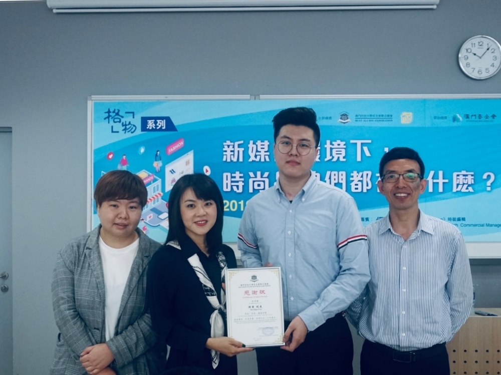 由澳門科技大學校友會聯合總會主辦的“格物”系列之“新媒體環境下,時尚品牌們都在玩兒什麼?”於2019年3月28日上午10時假澳門科技大學O座大樓506舉辦。本次講座邀請到現任全球第一奢侈品電商Farfetch的Commercial Manager:2016屆工商管理學士繆樊校友,擔任本次的主講嘉賓。出席是次講座的嘉賓還有澳門科技大學校友會聯合總會湯曦副理事長,澳門科技大學商學院管理學系系主任石貴成教授及卜慧美助理教授。為表感謝,湯曦副理事長向繆樊致送感謝狀以及紀念品。