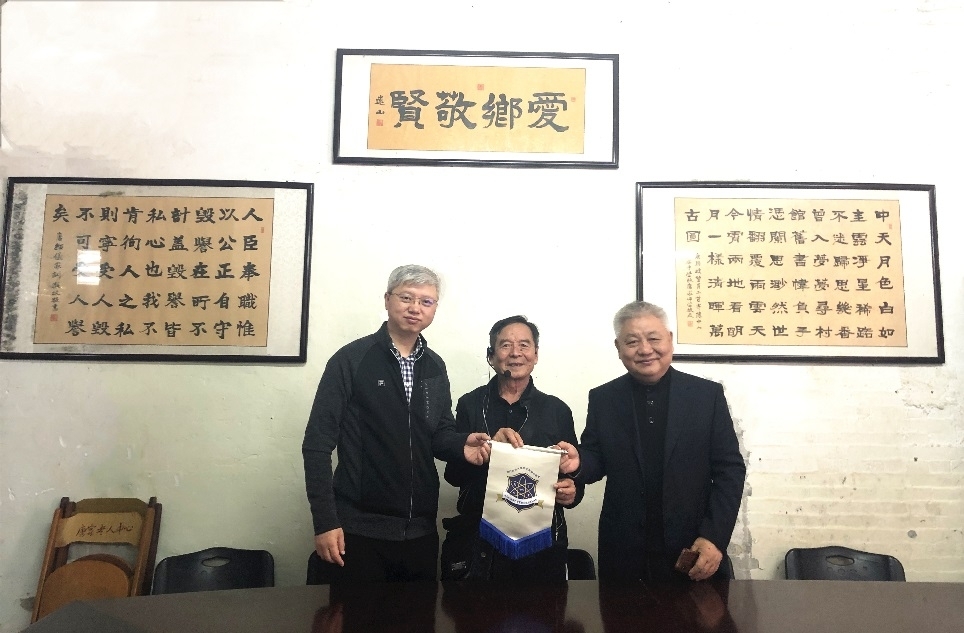 澳科大校友总会庞川会长(左)向唐廷枢研究中心戴龙基主任(右)、唐家历史文化研究会唐观挺会长致送校友会锦旗(于宝臣唐公祠)