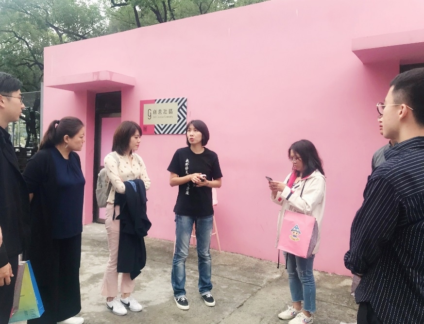 徐晞霖校友本科畢業於澳科大商學院,現在是深圳風火創意Ing Market項目負責人。她帶領校友們參觀 “成長的房子”——由玻璃工廠改造而來的創意園G&G創意社區,保留了工廠內部原有的水泥牆的色彩還有部分零件,改造成一個創意空間。