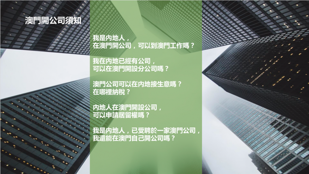 钟玲玲老师在分享中指出,目前澳门的税务安排相对宽松,成立澳门公司对于个人创业或者企开拓海外市场均有一定帮助。