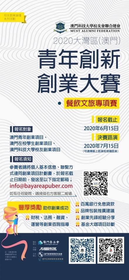 由澳门科技大学校友会联合总会主办的“2020大湾区(澳门)青年创新创业大赛”已正式启动。本次活动得到澳门基金会的赞助。大赛组委会希望透过本次面向全澳青年之双创比赛,发掘、培养具有潜力的本澳创业团队,并积极打造澳门青年创业孵化系统,为政府、金融业界、投资人及青年创业者提供信息互通、资源共享的创业平台。