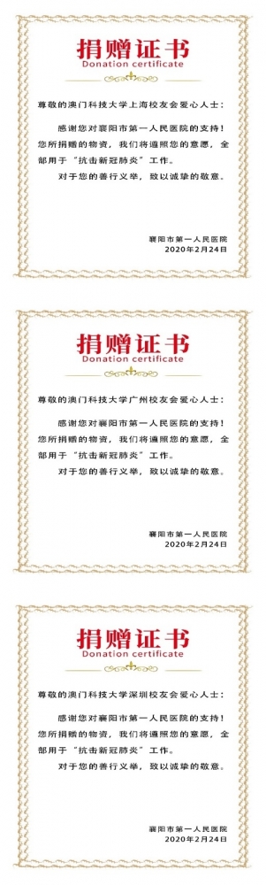 襄陽市第一人民醫院向澳科大上海校友會、廣州校友會、深圳校友會致捐贈證書表示感謝