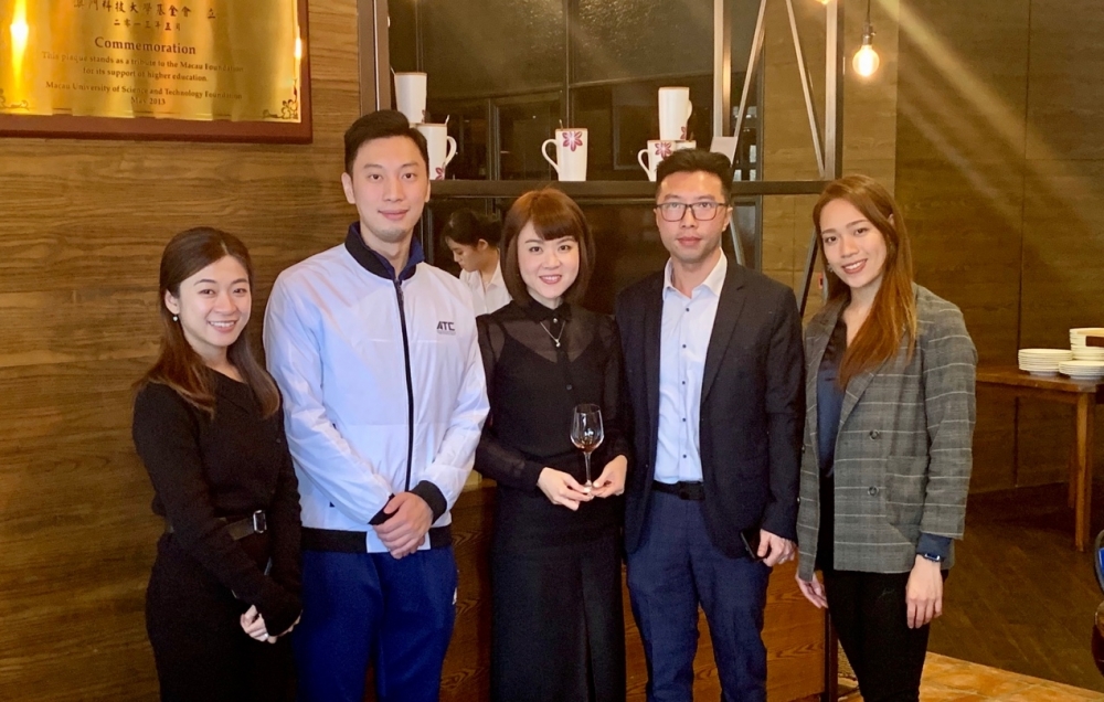 澳门理工学院校友会张绮华理事、尤俊贤理事、黄宇棋理事长、利安琪秘书(从左至右)与澳科大校友会汤曦副理事长(中)合影