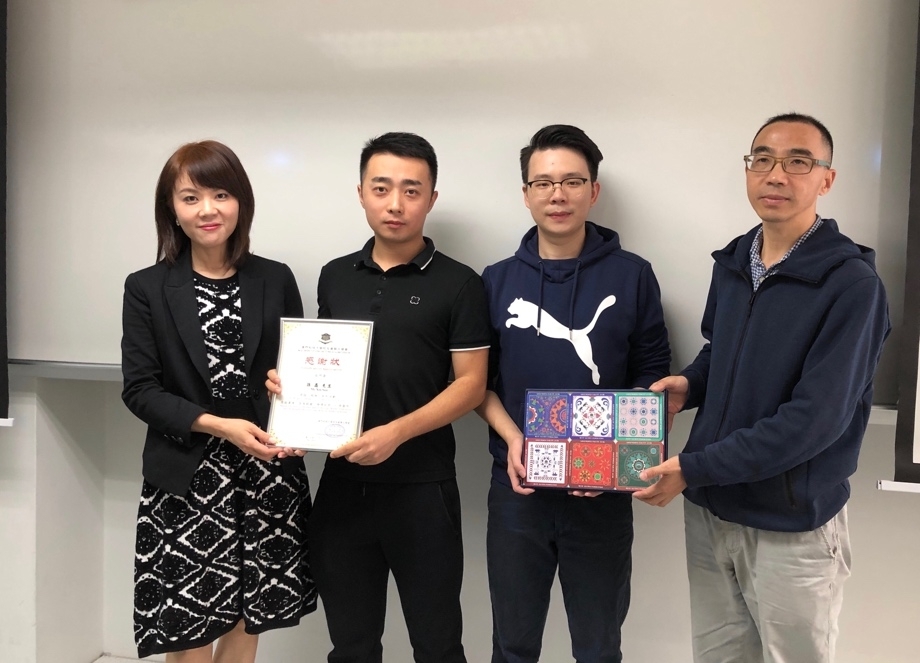 湯曦副理事長(左一)及趙慶林教授(右一)向孫鑫(左二)及梁宏韜贈送紀念品與感謝狀