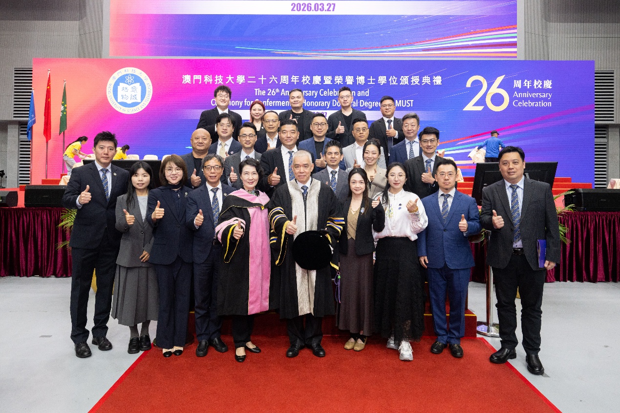 校友们出席了“澳门科技大学26周年校庆暨荣誉博士学位颁授典礼”及校庆学术讲座。母校今年向陈十一院士、冯骥才教授、卢煜明院士、克日什托夫·帕尔切夫斯基院士 (Prof. Krzysztof PALCZEWSKI)、钱乘旦教授、唐本忠院士、杨荣文先生共七位杰出人士颁授2026荣誉博士学位。朱健康校长致辞时称,大学授予终身荣誉博士学位,是对杰出人士的至高礼赞,表达了大学对各自领域或整个社会作出卓越贡献、产生重大影响的人士最崇高的敬意。澳科大校董会陈季敏副主席兼秘书长表示,七位荣誉博士成就斐然,加入澳科大不单是对大学的认同,更是对澳门高等教育事业的厚爱。她相信各位荣誉博士的睿智与风范,将为大学注入深厚的精神底蕴,为师生树立勇毅前行的榜样。参与典礼的校友们表示,有机会观礼见证母校建校廿六载发展成就,倍感荣幸与自豪。
