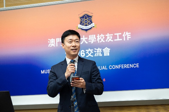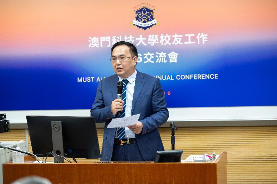 澳科大龐川副校長兼校友總會會員大會主席致歡迎辭,他代表大學及校友總會向與會校友致以最誠摯的歡迎,特別感謝各屬會為校友事業發展作出的突出貢獻並強調:“校友是母校最寶貴的財富,更是大學發展不可或缺的重要力量。校友總會堅持以校友為中心,不斷完善聯絡機制,持續構建更緊密、更有溫度的校友網絡,為母校建設與發展匯聚更強大的校友力量。”