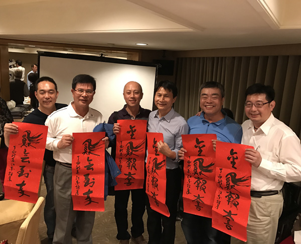 晚宴开始之前,台湾校友会南区分会会长辛纯浩博士邀请蔡江东博士执笔挥毫,并赠送每位与会校友现场书写的书法墨宝。此次春茗晚宴还特别邀请到澳科大刘廷扬访问教授、澳科大校友总会赖永吉监事长,以及台湾校友会北区分会林武田会长、李逸川秘书长等7位北区校友。现场气氛热烈,校友们相互问候,举杯畅谈。